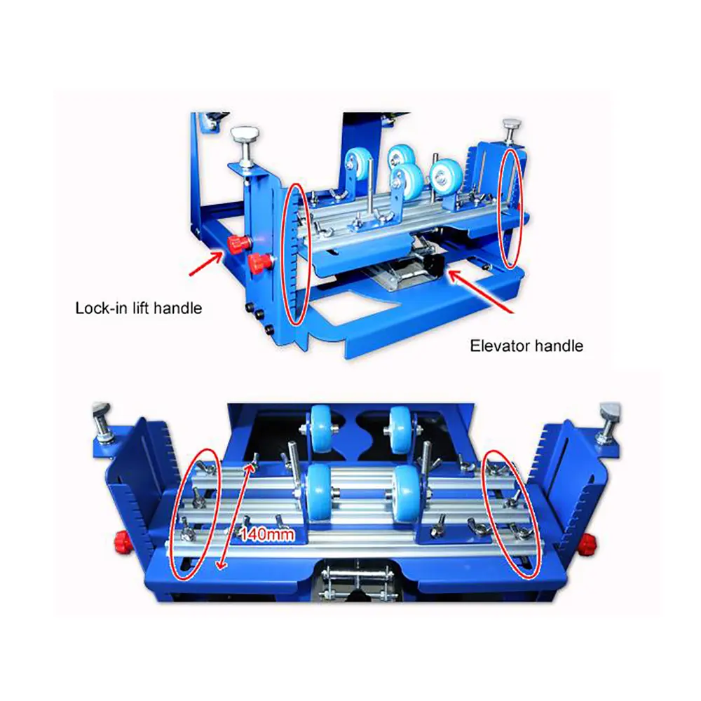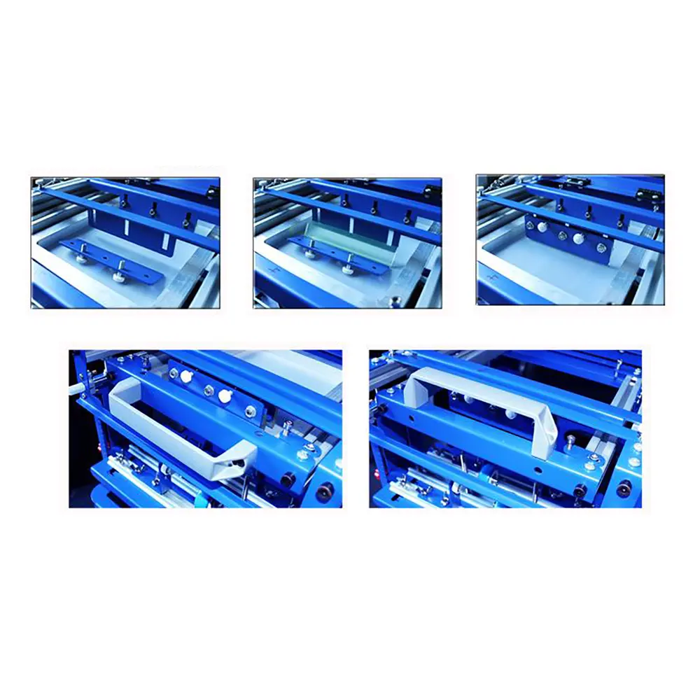 1. W tej maszynie zastosowano konstrukcję pozycjonującą wysokość ramy sita drukarskiego, przednia część jest wyposażona w równoległą płytkę umieszczającą, cała maszyna jest stabilna i stabilna w procesie drukowania. Materiały i narzędzia do drukowania, takie jak wiadra z atramentem, można umieścić na tylnej poziomej płycie głównej maszyny.